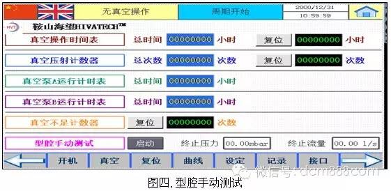 手動(dòng)模式下,按下啟動(dòng)鍵,當(dāng)系統(tǒng)壓力平衡后,將得到泄漏流量。模具泄漏量從1升/秒~5升/秒,取決于產(chǎn)品對(duì)真空度的要求。